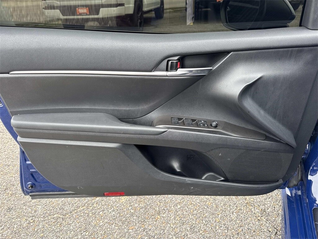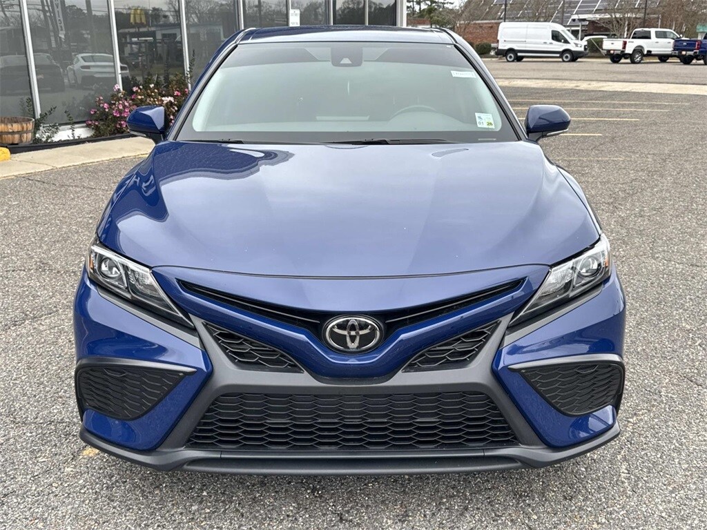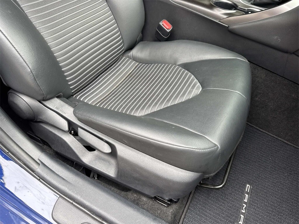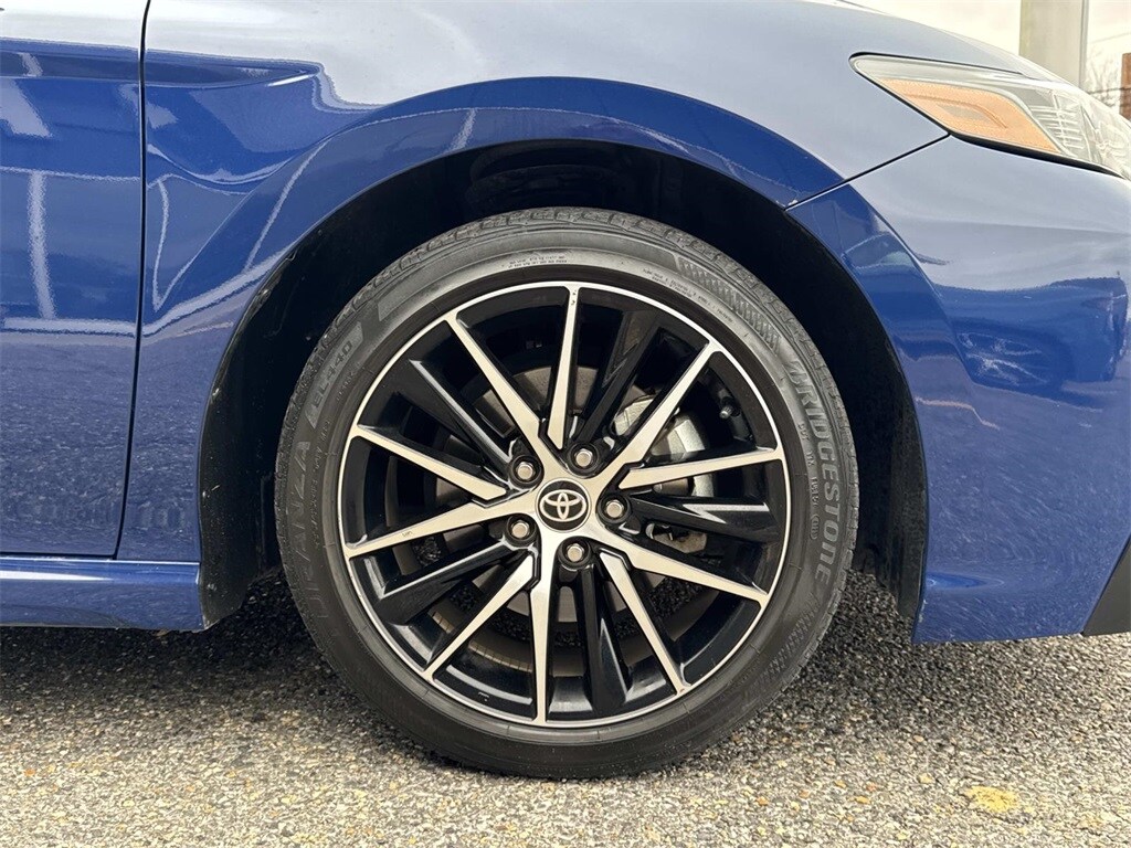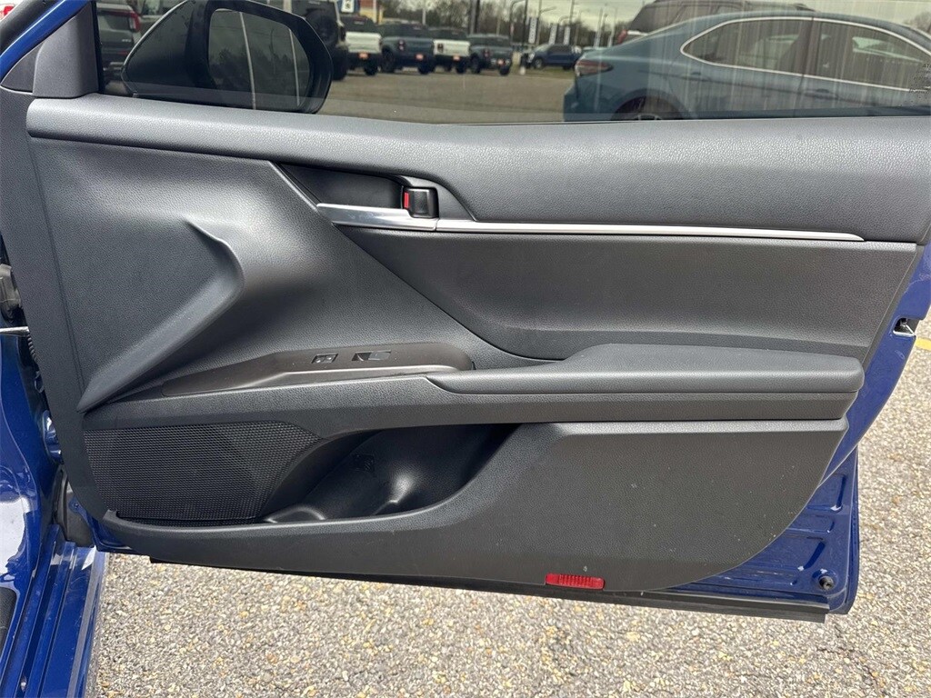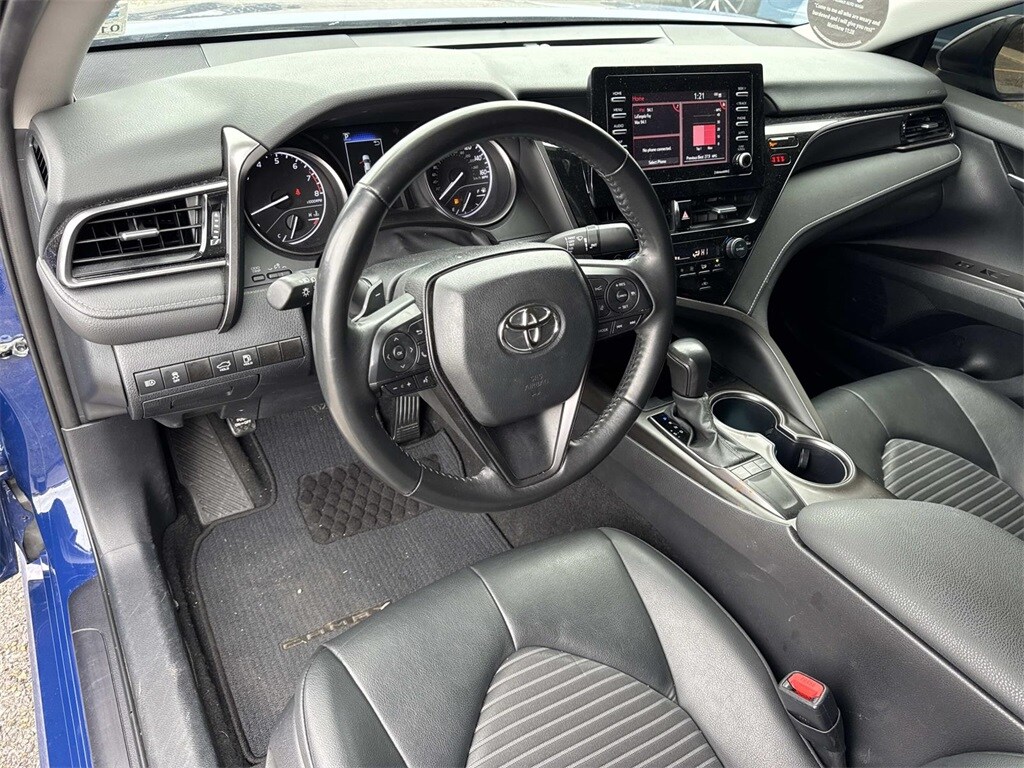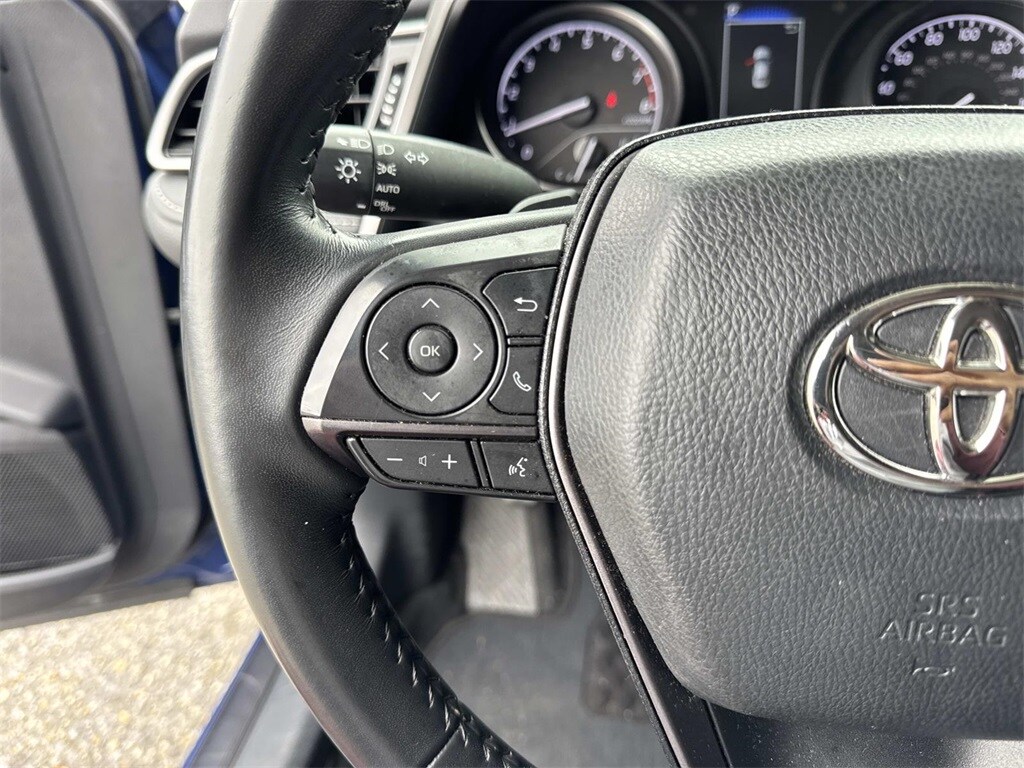 Blue This Camry SE Nightshade is nicely equipped with 4-Wheel Disc Brakes, 6 Speakers, ABS brakes, Air Conditioning, Alloy wheels, AM/FM radio: SiriusXM, Apple CarPlay/Android Auto, Auto High-beam Headlights, Automatic temperature control, Brake assist, Bumpers: body-color, Delay-off headlights, Driver door bin, Driver vanity mirror, Dual front impact airbags, Dual front side impact airbags, Electronic Stability Control, Emergency communication system: Safety Connect (1-year trial), Exterior Parking Camera Rear, Four wheel independent suspension, Front anti-roll bar, Front Bucket Seats, Front Center Armrest, Front dual zone A/C, Front reading lights, Fully automatic headlights, Heated door mirrors, Illuminated entry, Knee airbag, Leather steering wheel, Low tire pressure warning, Occupant sensing airbag, Outside temperature display, Overhead airbag, Overhead console, Panic alarm, Passenger door bin, Passenger vanity mirror, Power door mirrors, Power driver seat, Power steering, Power windows, Radio data system, Radio: Audio, Rear anti-roll bar, Rear seat center armrest, Rear side impact airbag, Rear window defroster, Remote keyless entry, Security system, Speed control, Speed-sensing steering, Split folding rear seat, Spoiler, Sport SofTex Seat Trim w/Fabric Inserts, Steering wheel mounted audio controls, Tachometer, Telescoping steering wheel, Tilt steering wheel, Traction control, Trip computer, Turn signal indicator mirrors, Variably intermittent wipers, and Wheels: 19" x 8.5J Alloy.
