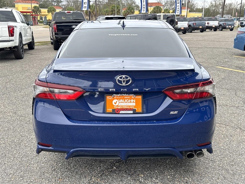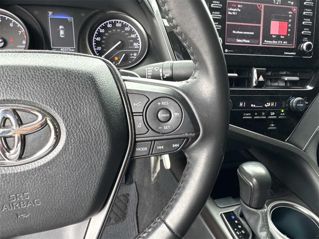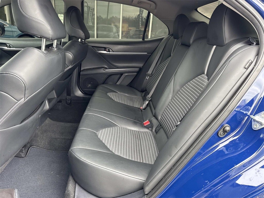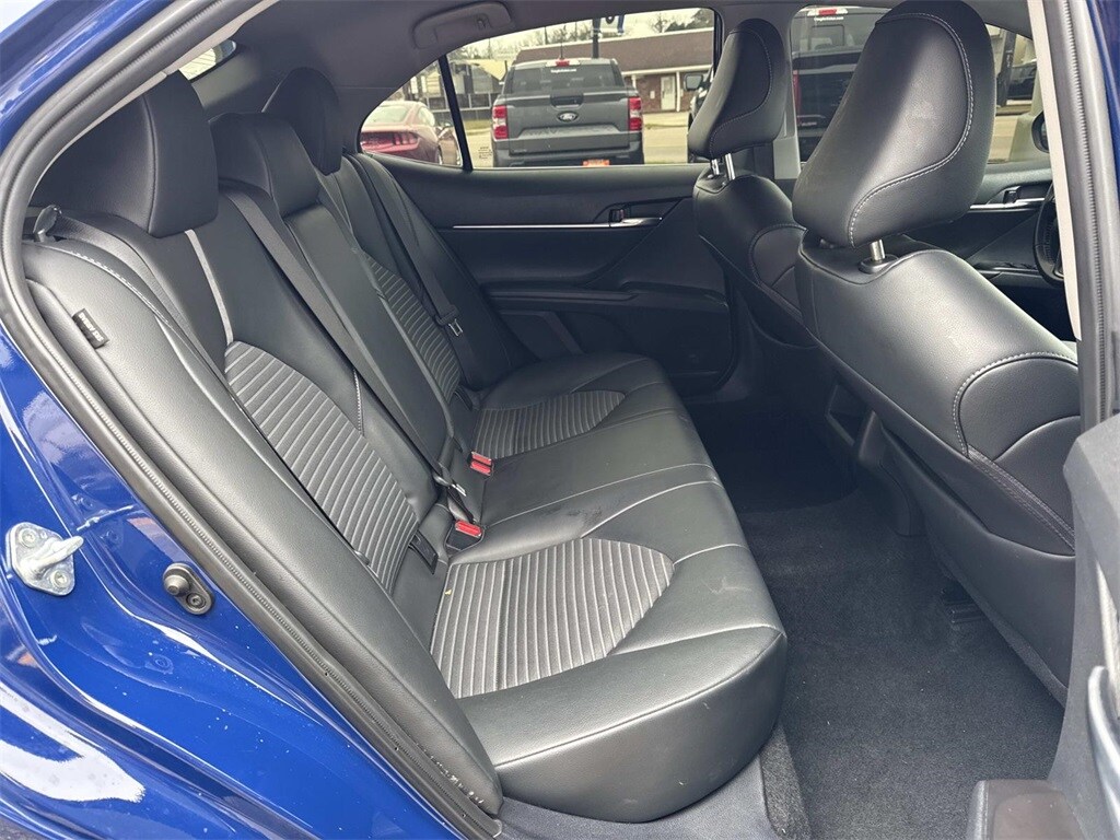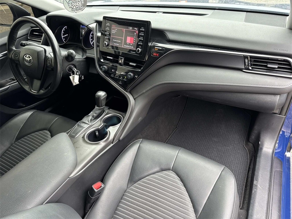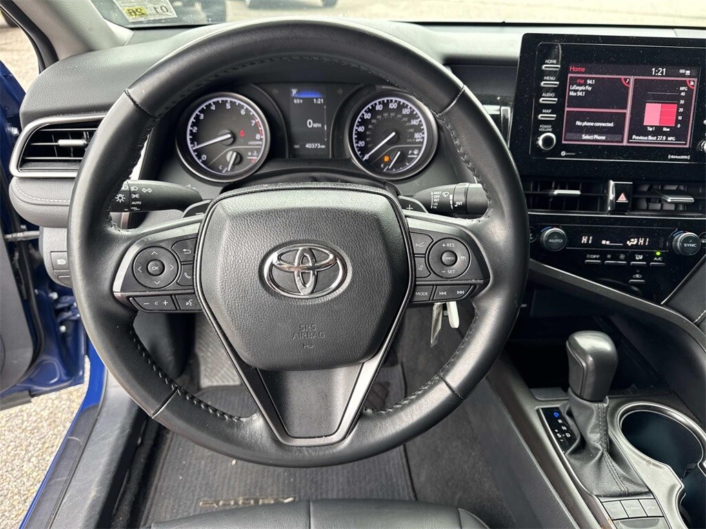 Blue This Camry SE Nightshade is nicely equipped with 4-Wheel Disc Brakes, 6 Speakers, ABS brakes, Air Conditioning, Alloy wheels, AM/FM radio: SiriusXM, Apple CarPlay/Android Auto, Auto High-beam Headlights, Automatic temperature control, Brake assist, Bumpers: body-color, Delay-off headlights, Driver door bin, Driver vanity mirror, Dual front impact airbags, Dual front side impact airbags, Electronic Stability Control, Emergency communication system: Safety Connect (1-year trial), Exterior Parking Camera Rear, Four wheel independent suspension, Front anti-roll bar, Front Bucket Seats, Front Center Armrest, Front dual zone A/C, Front reading lights, Fully automatic headlights, Heated door mirrors, Illuminated entry, Knee airbag, Leather steering wheel, Low tire pressure warning, Occupant sensing airbag, Outside temperature display, Overhead airbag, Overhead console, Panic alarm, Passenger door bin, Passenger vanity mirror, Power door mirrors, Power driver seat, Power steering, Power windows, Radio data system, Radio: Audio, Rear anti-roll bar, Rear seat center armrest, Rear side impact airbag, Rear window defroster, Remote keyless entry, Security system, Speed control, Speed-sensing steering, Split folding rear seat, Spoiler, Sport SofTex Seat Trim w/Fabric Inserts, Steering wheel mounted audio controls, Tachometer, Telescoping steering wheel, Tilt steering wheel, Traction control, Trip computer, Turn signal indicator mirrors, Variably intermittent wipers, and Wheels: 19" x 8.5J Alloy.