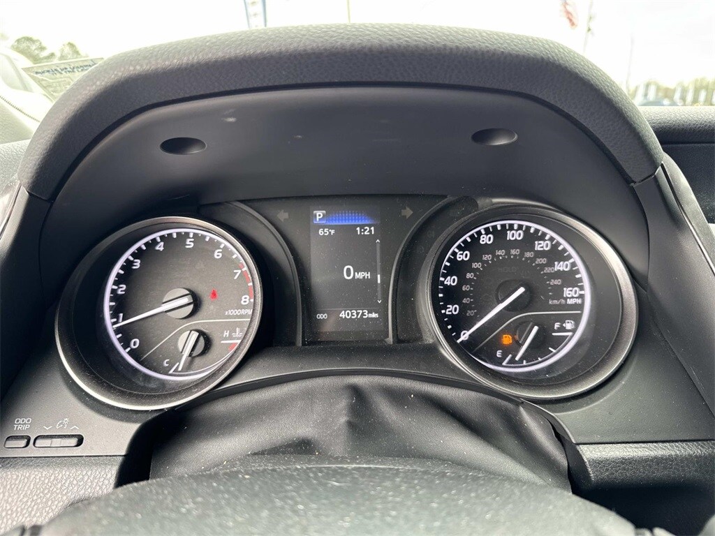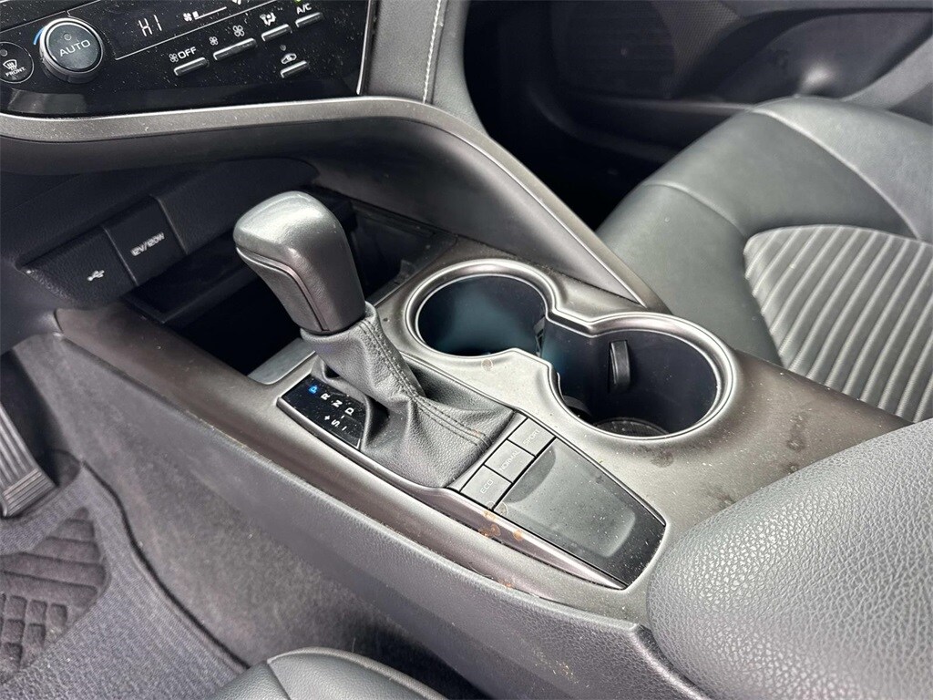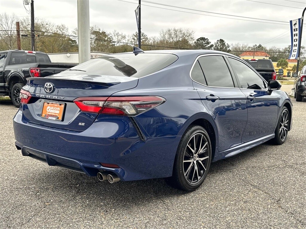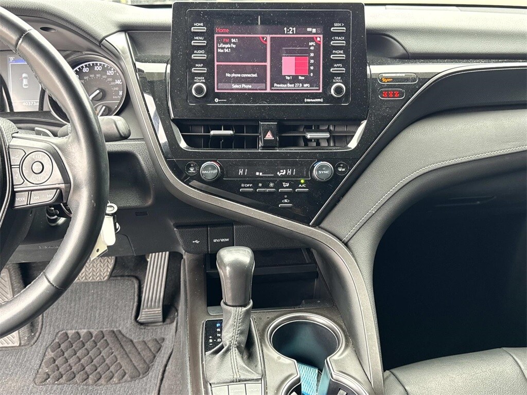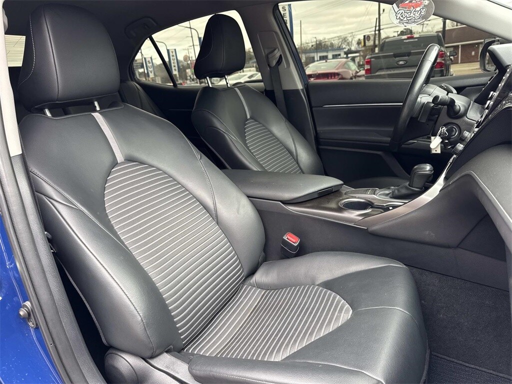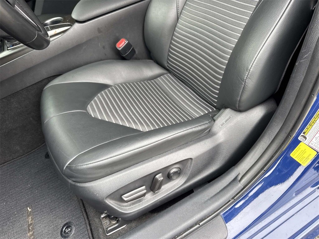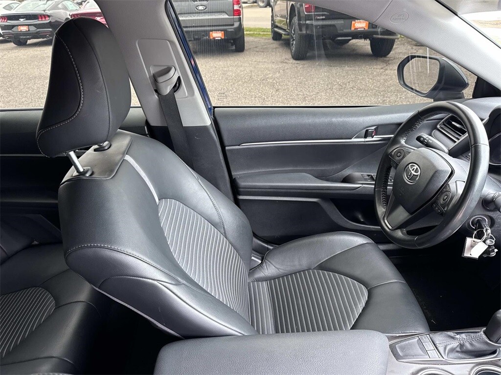Blue This Camry SE Nightshade is nicely equipped with 4-Wheel Disc Brakes, 6 Speakers, ABS brakes, Air Conditioning, Alloy wheels, AM/FM radio: SiriusXM, Apple CarPlay/Android Auto, Auto High-beam Headlights, Automatic temperature control, Brake assist, Bumpers: body-color, Delay-off headlights, Driver door bin, Driver vanity mirror, Dual front impact airbags, Dual front side impact airbags, Electronic Stability Control, Emergency communication system: Safety Connect (1-year trial), Exterior Parking Camera Rear, Four wheel independent suspension, Front anti-roll bar, Front Bucket Seats, Front Center Armrest, Front dual zone A/C, Front reading lights, Fully automatic headlights, Heated door mirrors, Illuminated entry, Knee airbag, Leather steering wheel, Low tire pressure warning, Occupant sensing airbag, Outside temperature display, Overhead airbag, Overhead console, Panic alarm, Passenger door bin, Passenger vanity mirror, Power door mirrors, Power driver seat, Power steering, Power windows, Radio data system, Radio: Audio, Rear anti-roll bar, Rear seat center armrest, Rear side impact airbag, Rear window defroster, Remote keyless entry, Security system, Speed control, Speed-sensing steering, Split folding rear seat, Spoiler, Sport SofTex Seat Trim w/Fabric Inserts, Steering wheel mounted audio controls, Tachometer, Telescoping steering wheel, Tilt steering wheel, Traction control, Trip computer, Turn signal indicator mirrors, Variably intermittent wipers, and Wheels: 19" x 8.5J Alloy.